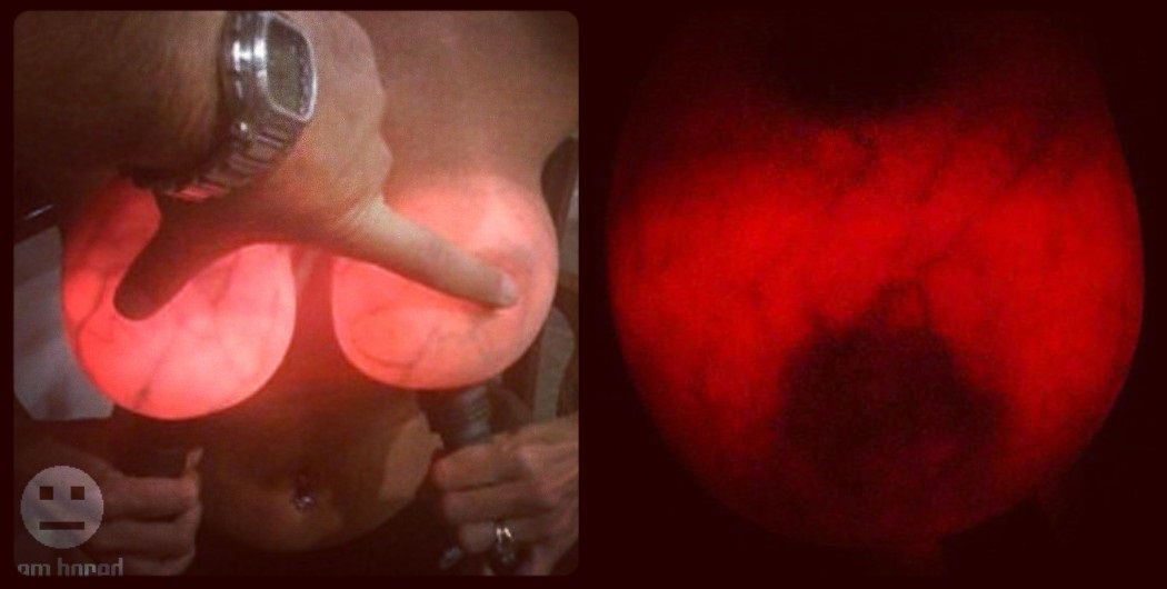 So this little trick popped up in the Facebook groups. Did you know that if you hold a flashlight to a boob with an expander or an implant, it will glow? Yes, yes I did try this myself. Gives a new meaning to HEADLIGHTS! The left is the image from i-am-bored.com circulating the groups; the right is my version. You can see the shade of the expander port in the top of the image. Creepy!