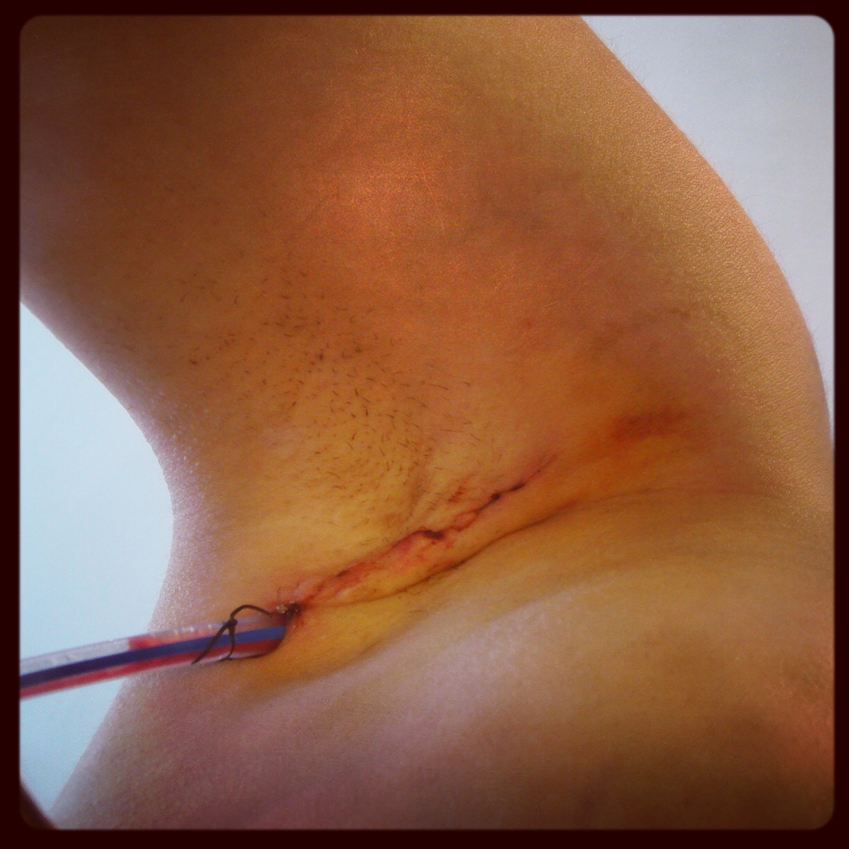 This helps explain why my left side hurts so darn much! In addition to the internal sculpting, I also have a large incision and the drain tube in my armpit. Doing my best to not move my left arm! I’m still Norco-ing it up every six hours and the drain has been kicking out close to 100mL/day. I went in on Friday with the expectation that I’d be leaving it behind, but at this rate, I’m not sure we’ll be able to remove it when I go back on Monday.