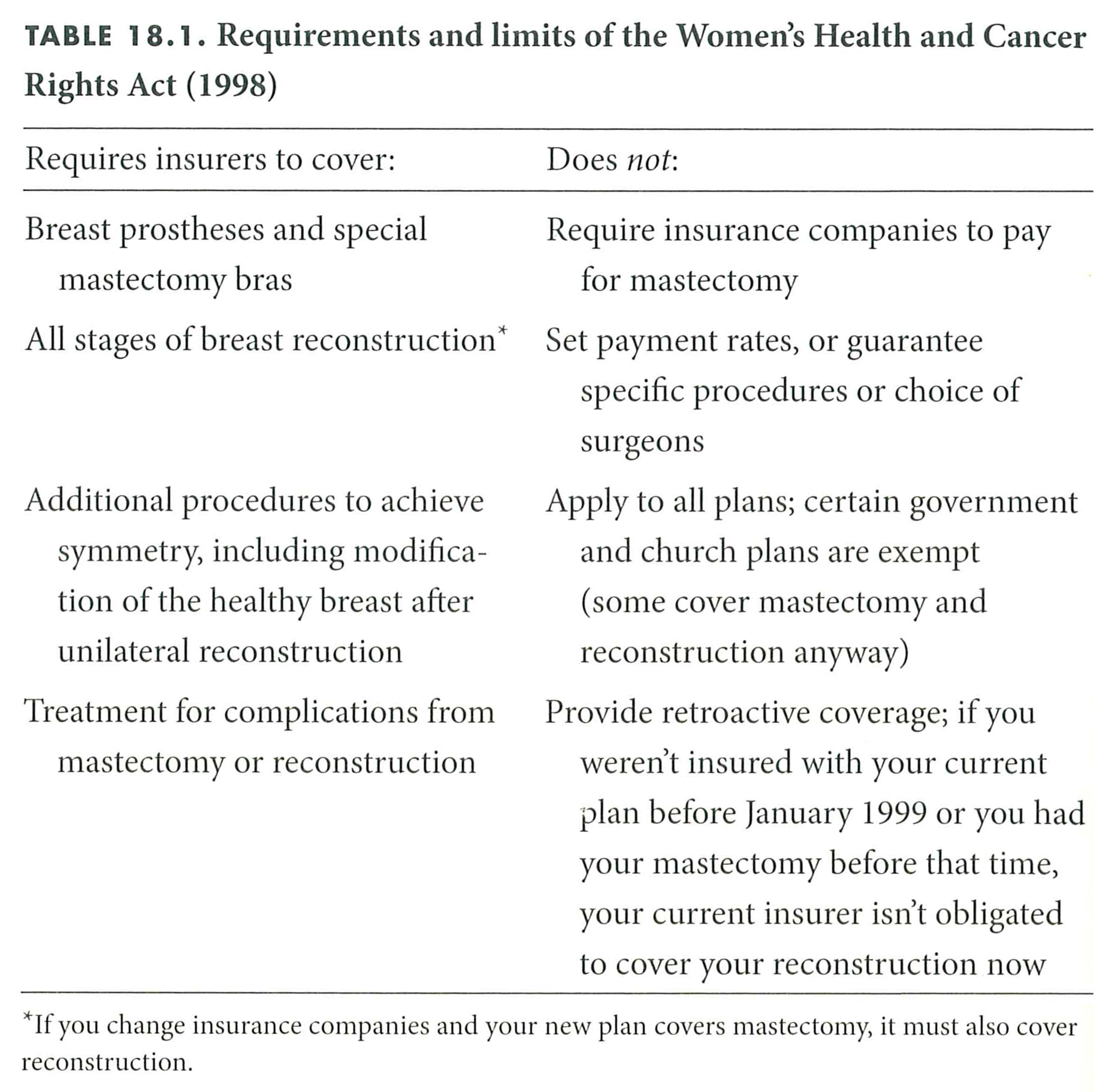 You may have heard of a law that requires insurance companies to pay for these procedures. This is it, but there are some caveats. First, the WHCRA does not require insurance companies to pay for a mastectomy. Your scenario will have to meet the provider’s criteria to be eligible for that coverage. However, if a mastectomy is covered, then reconstruction and any resulting complications must be covered. Also, you must still follow the rules as far as pre-authorization, cost sharing, and in/out-of-network providers are concerned. This law doesn’t extend to Medicare or Medicaid, but those have their own mastectomy-related benefits. Here are some additional points from the extremely helpful The Breast Reconstruction Guidebook (get this book!):
